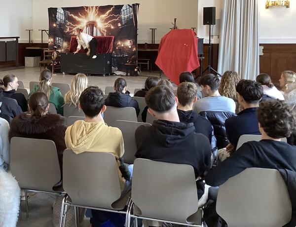 Der English-Theatre-Tag hat am MLG schon seit vielen Jahren einen festen Platz. In den vergangenen Jahren wird er erfolgreich in Zusammenarbeit mit der Phoenix Theatre Company gestaltet. Am Montag, den 10.11.2025, verwandelte sich die Aula des MLG erneut in eine kleine Theaterbühne, auf der die beiden Schauspieler, beide native speakers, mit viel Einsatz drei altersgerechte englischsprachige Stücke präsentierten. Die 6. Klassen sahen ein humorvolles Cowboy-Stück, die Stufen 8 und 10 beschäftigten sich mit dem Thema Einwanderung in den USA, und die Kursstufe tauchte in die schaurige und geheimnisvolle Welt von Frankenstein ein. Dabei überzeugten die beiden Darsteller nicht nur durch authentisches Spiel, sondern auch durch ihre unterschiedliche Art: Matt mit seiner sonoren Stimme und seiner natürlichen, humorvollen Ausstrahlung; Mia durch ihre ausdrucksstarke körperliche Darstellung – sei es als Kreatur in Frankenstein oder als exzentrischer Wild Bill Jones. Für viele Schülerinnen und Schüler war es eine interessante Erfahrung, Bühnenspiel auf Englisch live mitzuerleben und sich dabei auf verschiedene Akzente einzustellen. Aus der Schülerschaft und dem Kollegium kamen zahlreiche positive Rückmeldungen. Dank der finanziellen Unterstützung des Freundeskreises können wir dieses Angebot auch in den kommenden Jahren fortsetzen.